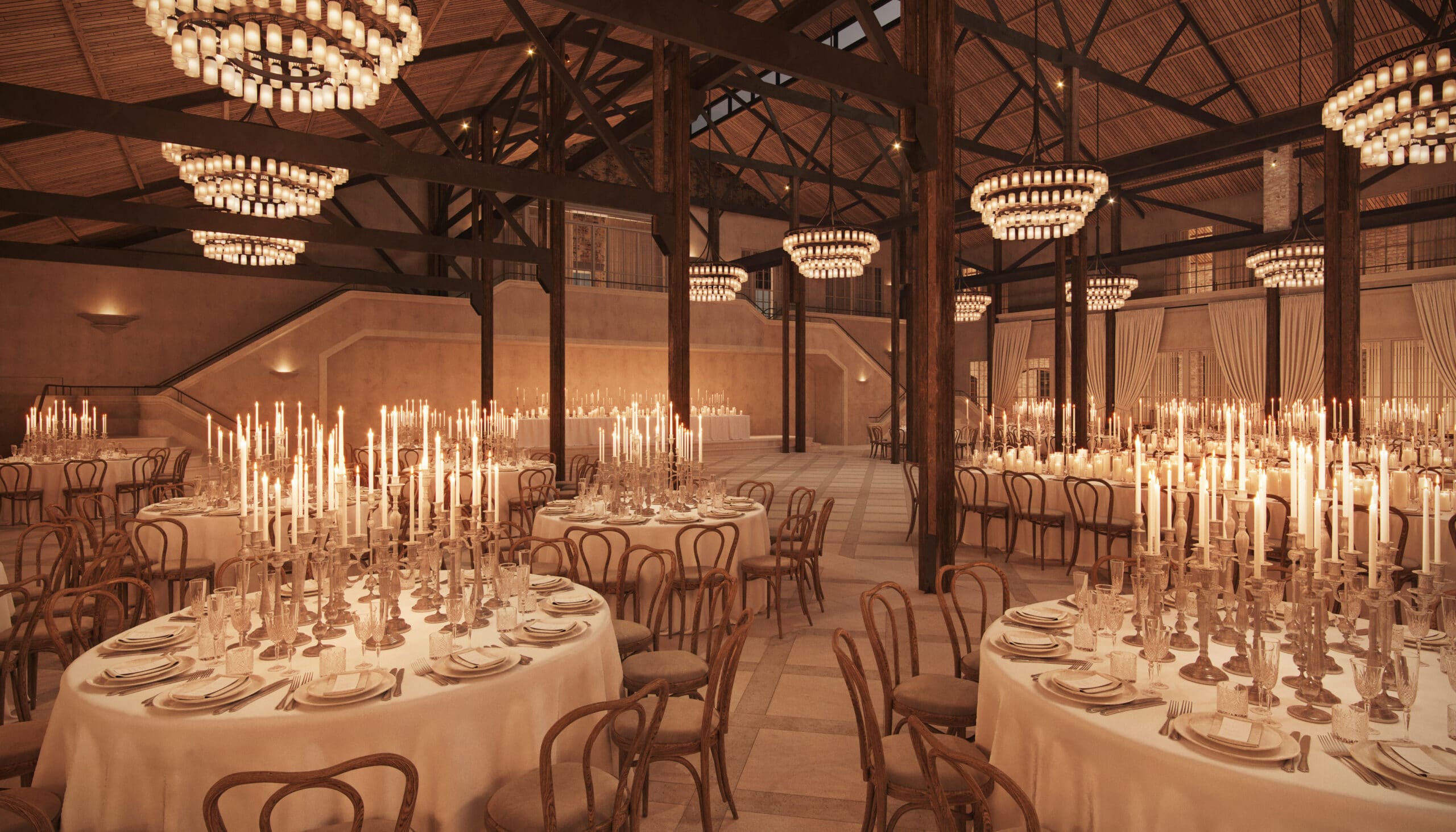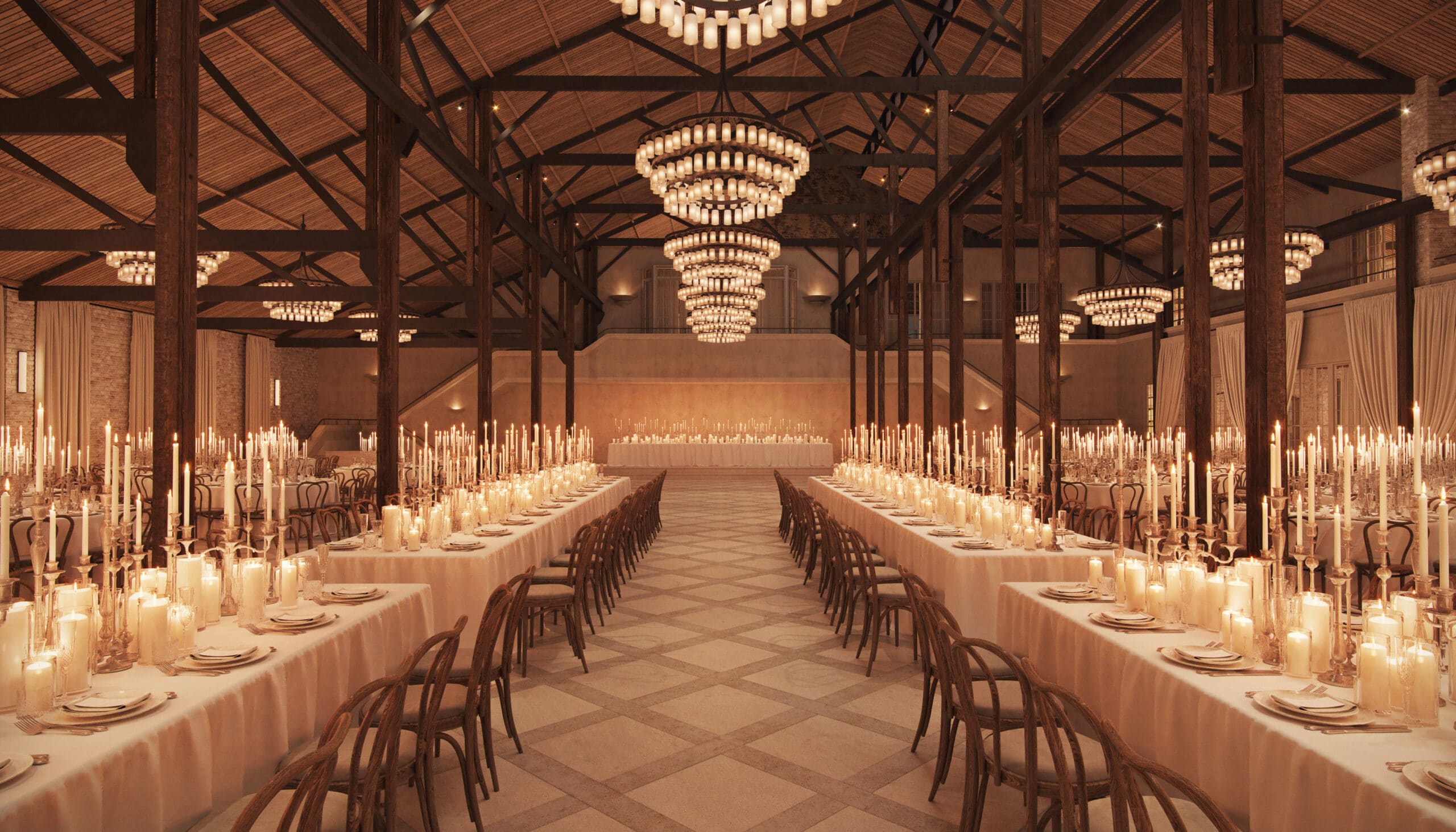Bold yet welcoming, Rosebery Hall is a space where every celebration feels effortlessly special. Once the site of a major manufacturing hub, exposed timber trusses and rhythmic beams hint at the building’s industrial past, while layered chandeliers suspended beneath the soaring ceiling cast a warm, inviting glow over textured, tumbled limestone floors.